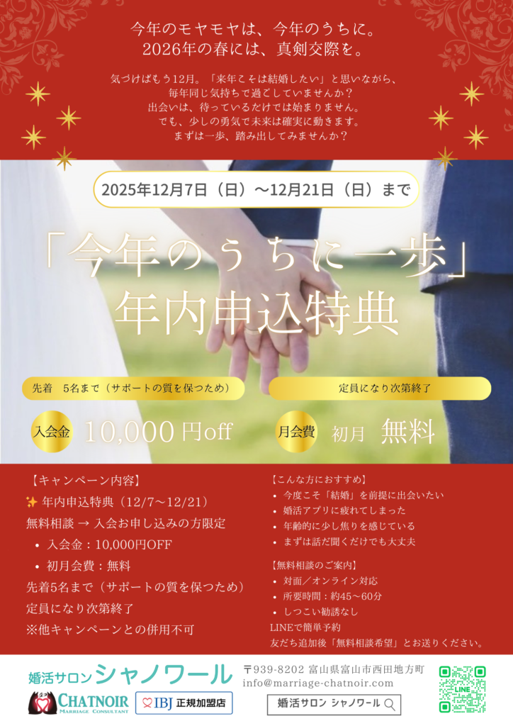 年内お申込みの方に特典をご用意した、期間限定・先着5名様のご案内。